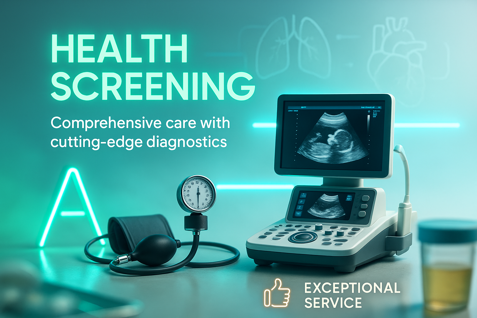 /Collection: /by davooda/Type: PNG/Engaging promotional graphic showcasing health screening services with diagnostic equipment. Ideal for medical marketing campaigns targeting patients.