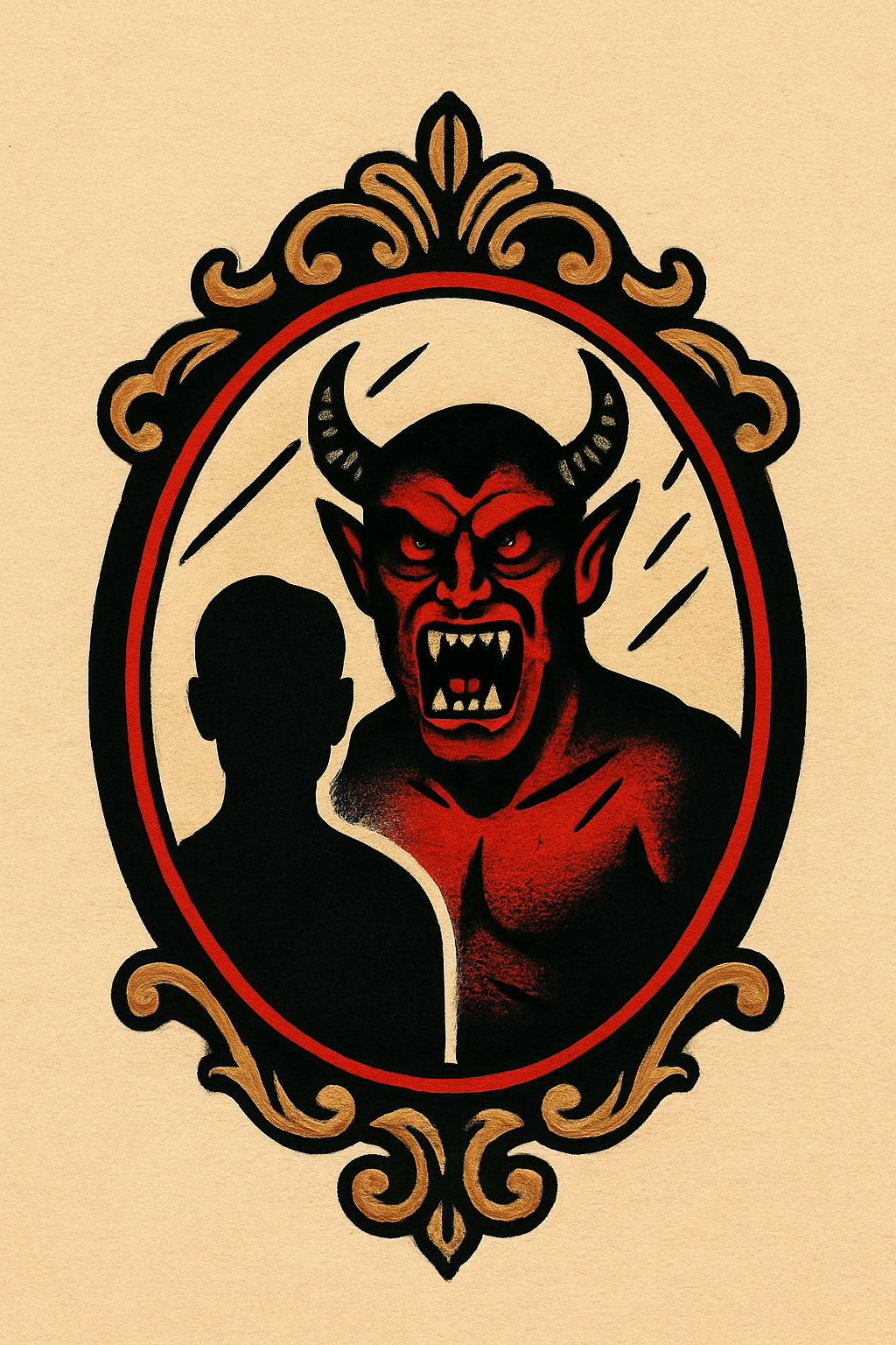 A striking tattoo design featuring a silhouette of a person and a monstrous figure in a mirror. The artwork is colorful on a beige background, highlighting the contrast between the two images.