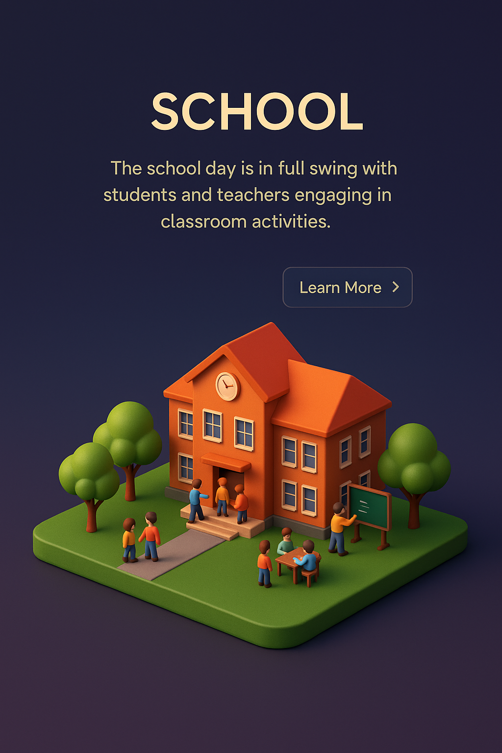 /Collection: /by davooda/Type: PNG/A vibrant 3D scene depicting a school with students and teachers actively participating in various classroom activities. The scene is designed with a smooth gradient background, enhancing the focus on the school structure.