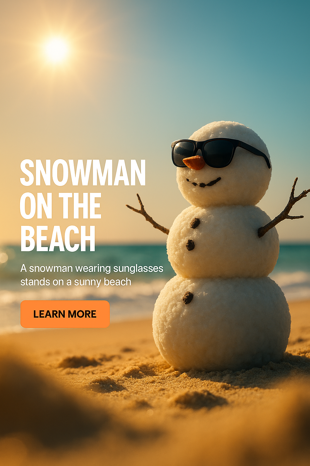 This vibrant image features a snowman wearing sunglasses on a sunny beach, blending winter and summer themes. Ideal for social media or promotional content.