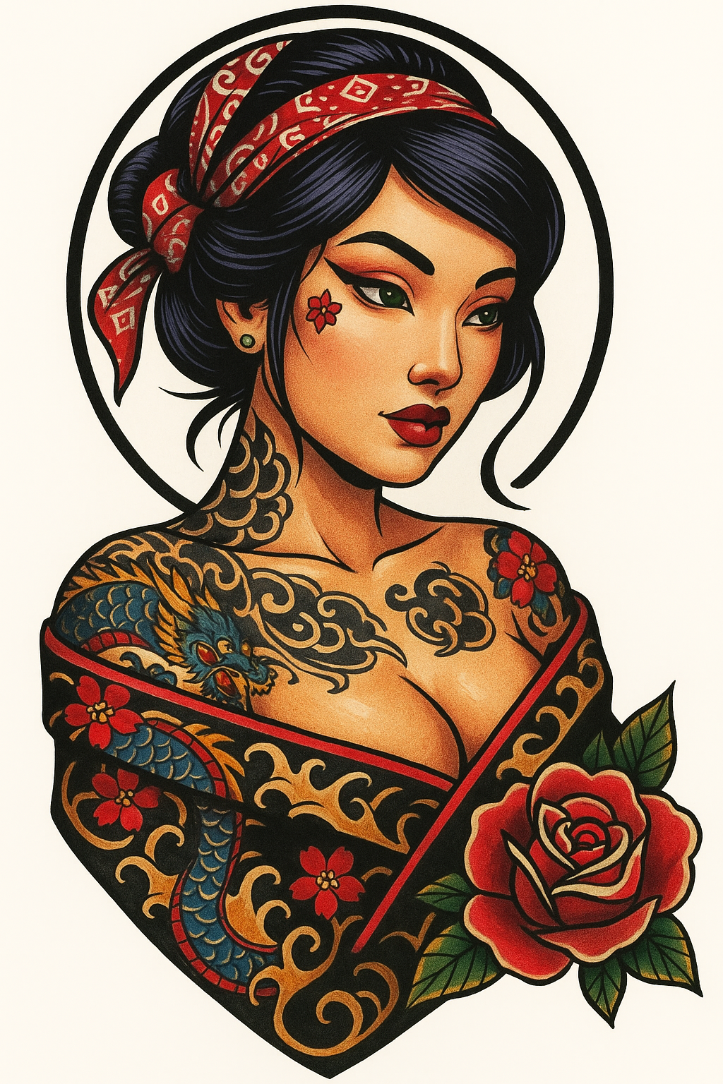 /Collection: /by davooda/Type: PNG/A vibrant tattoo design depicting a geisha adorned with intricate tattoos, wearing a kimono with open shoulders. She has a rose and a dragon tattoo, framed artistically.
