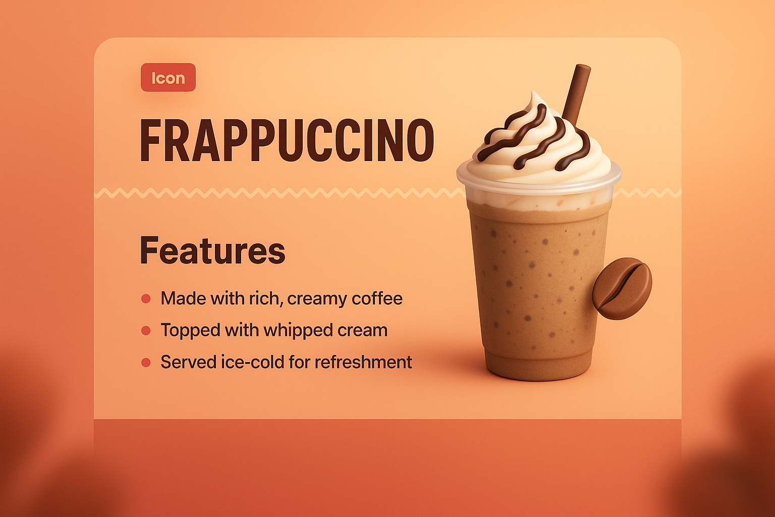 /Collection: /by davooda/Type: PNG/A visually appealing landing page featuring a 3D illustration of a frappuccino. The design includes feature highlights, a gradient background, and a stylish layout.