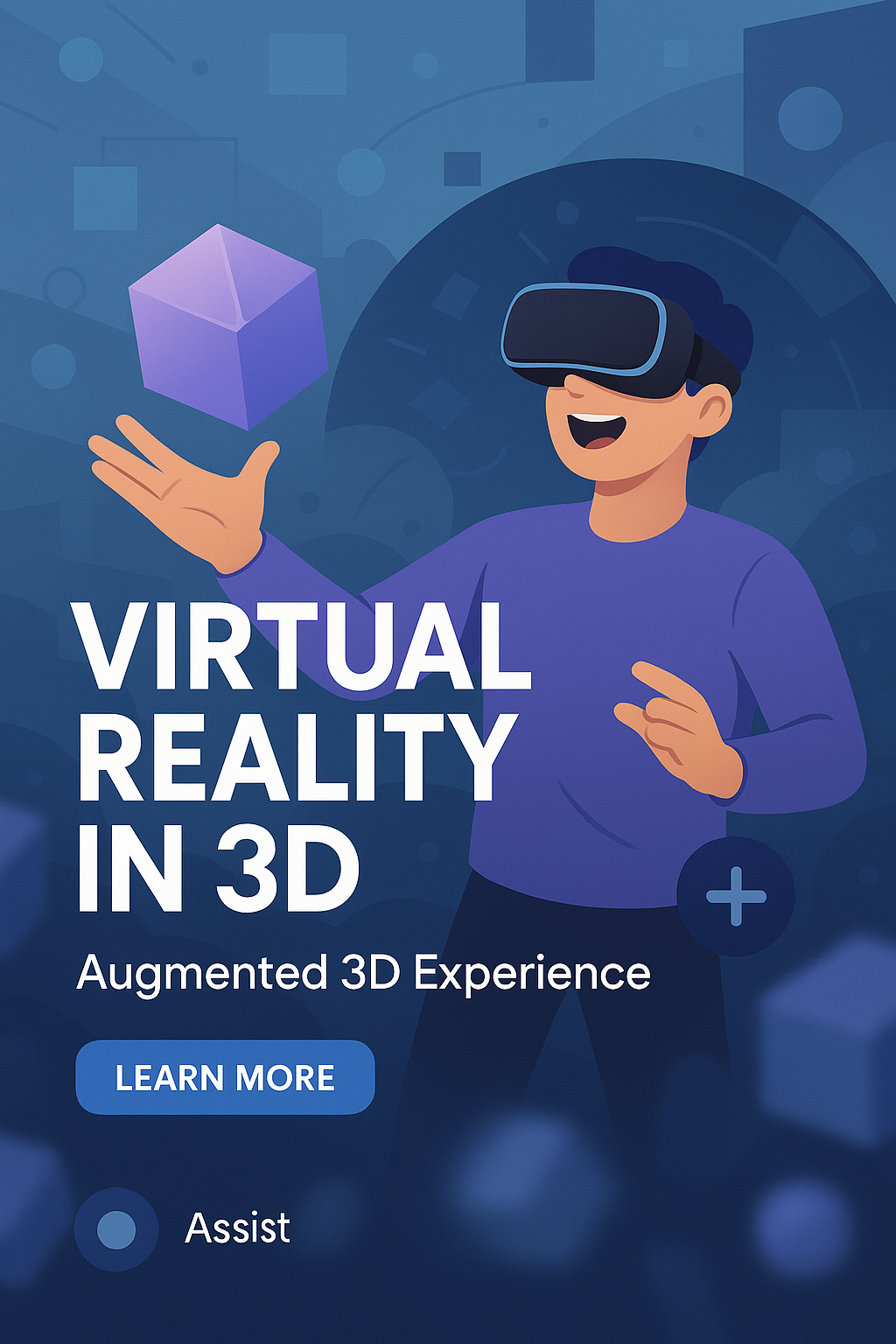 Vibrant promotional graphic showcasing a user experiencing virtual reality with 3D elements, ideal for tech and gaming marketing.