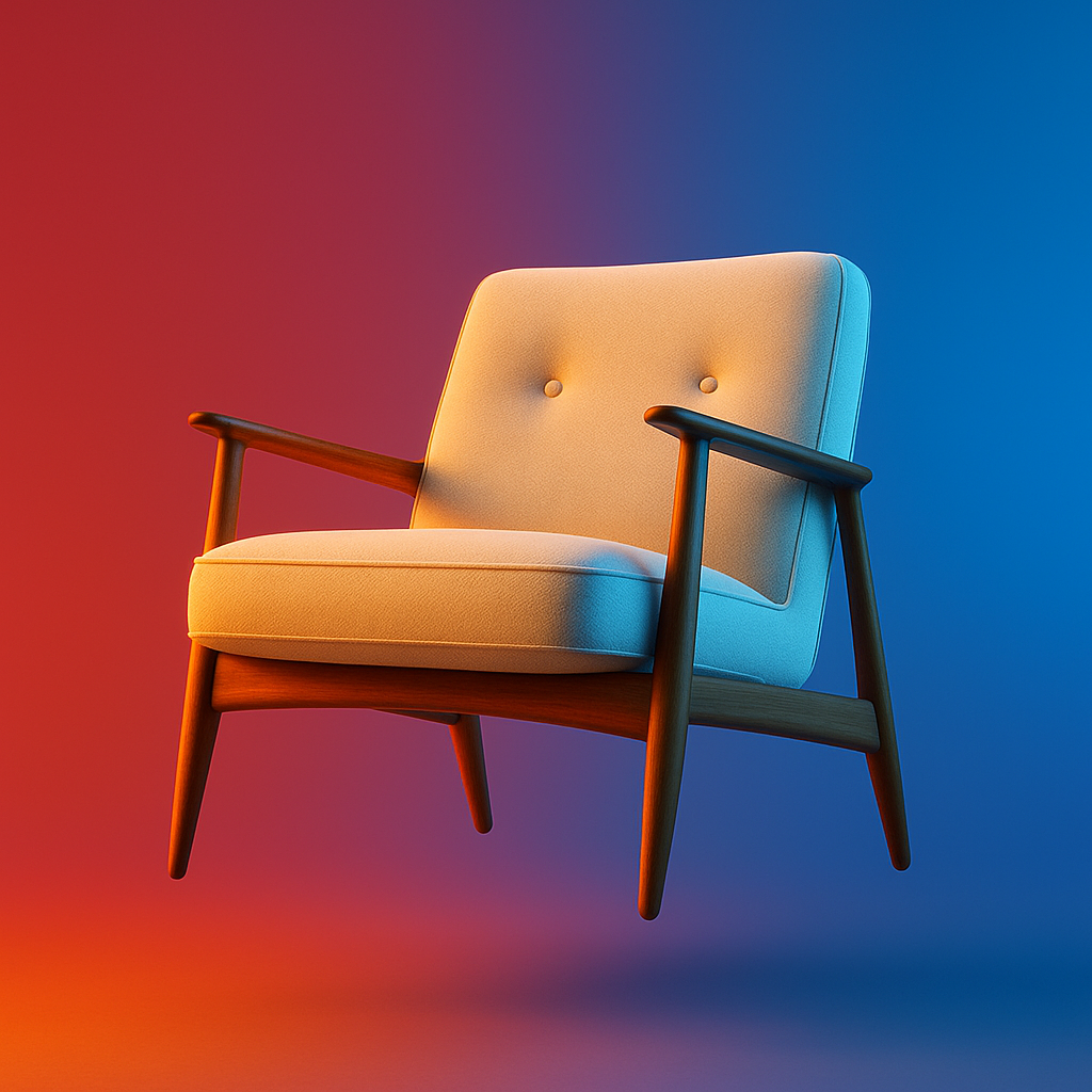 /Collection: /by davooda/Type: PNG/A modern mid-century living room featuring a white floating armchair against a smooth gradient background of blue and red. The chair is illuminated from both sides, showcasing its elegant design.