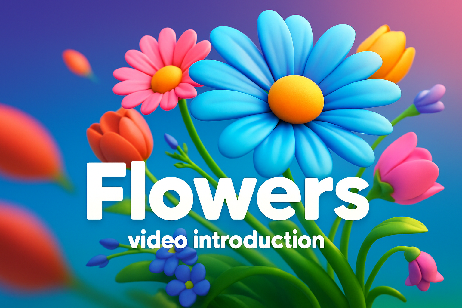 /Collection: /by davooda/Type: PNG/A vibrant 3D illustration of colorful flowers dominates the scene, with a smooth gradient background. The title 'Flowers' is bold and eye-catching, complemented by a playful subtitle.
