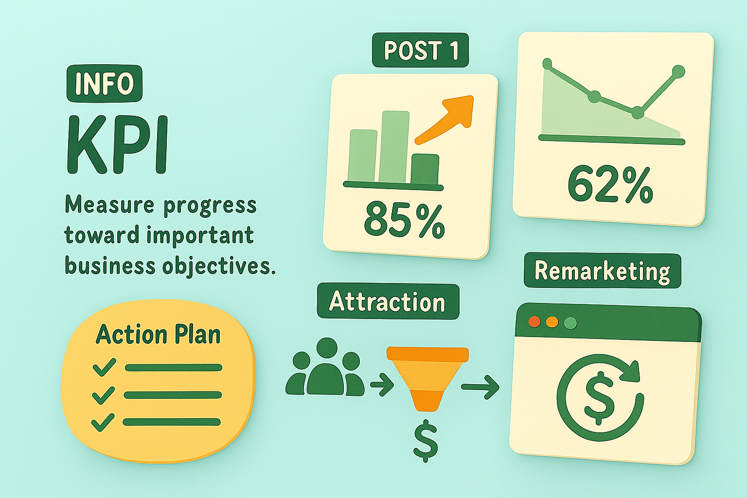 A vibrant infographic illustrating key performance indicators (KPIs) for business objectives, featuring graphs and icons. Ideal for presentations and reports.