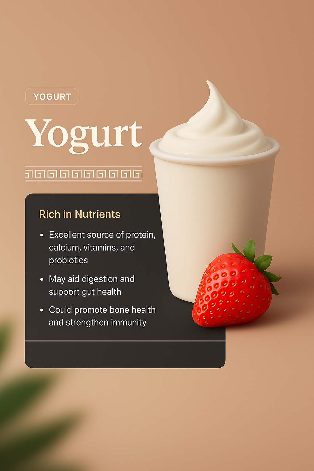 A visually appealing 3D illustration of yogurt in a cup, accompanied by a fresh strawberry. The design features a nutrient block with benefits listed, set against a smooth gradient background.