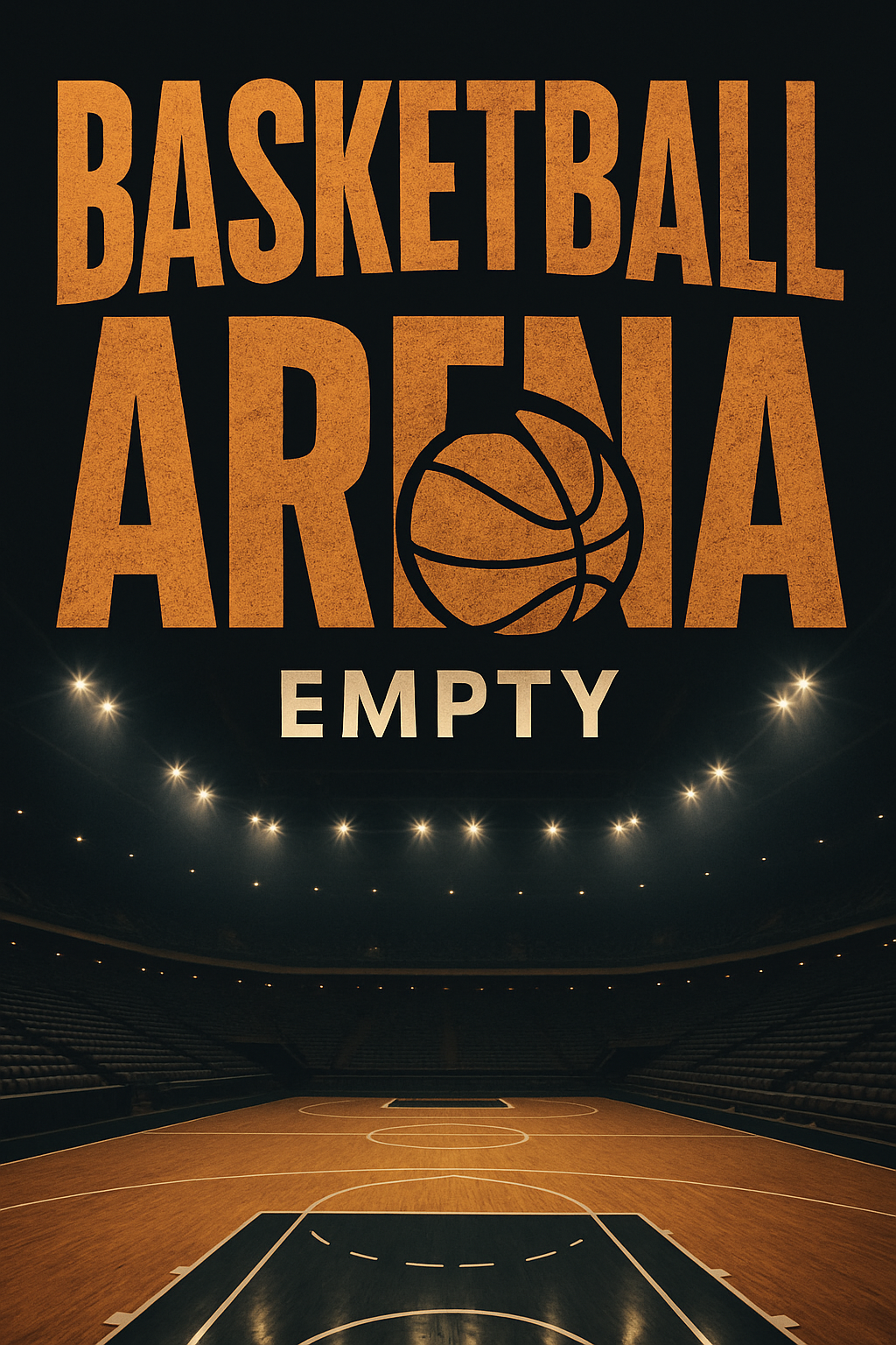 Dramatic graphic depicting an empty basketball arena with bold typography, perfect for sports-related promotions or events.