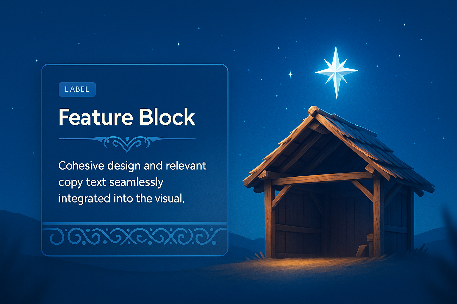 A serene night scene depicting a wooden stable under a starry sky, featuring a highlighted star above. A feature block is integrated, showcasing relevant text and design elements.
