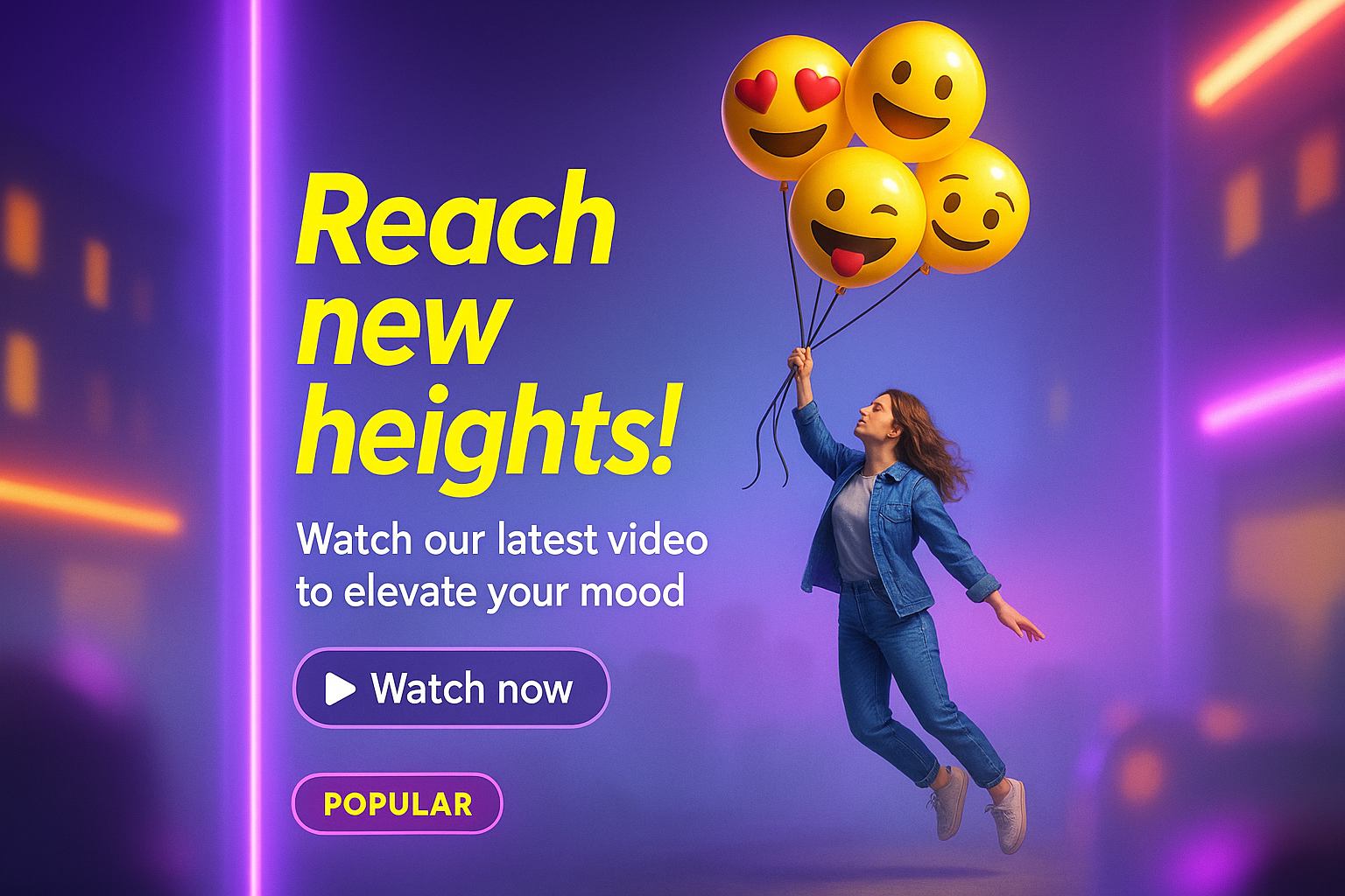 Vibrant social media post featuring a joyful person with emoji balloons, designed to attract viewers to a video. Ideal for uplifting content marketing.