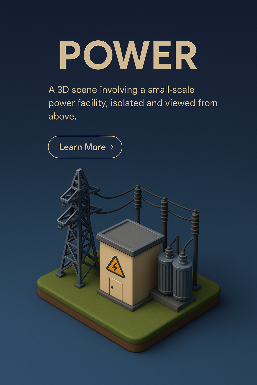 /Collection: /by davooda/Type: PNG/A visually striking 3D illustration of a small power facility, featuring a power tower and equipment, viewed from a distance. The dark gradient background enhances the vibrant details of the scene.