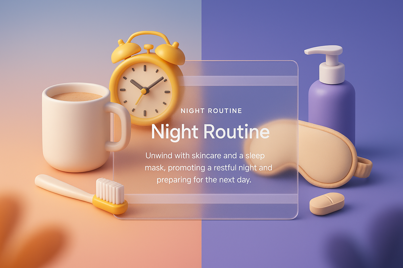 A 3D illustration showcasing morning and night routines, featuring a coffee cup, alarm clock, skincare products, and a sleep mask, integrated with a transparent text block.