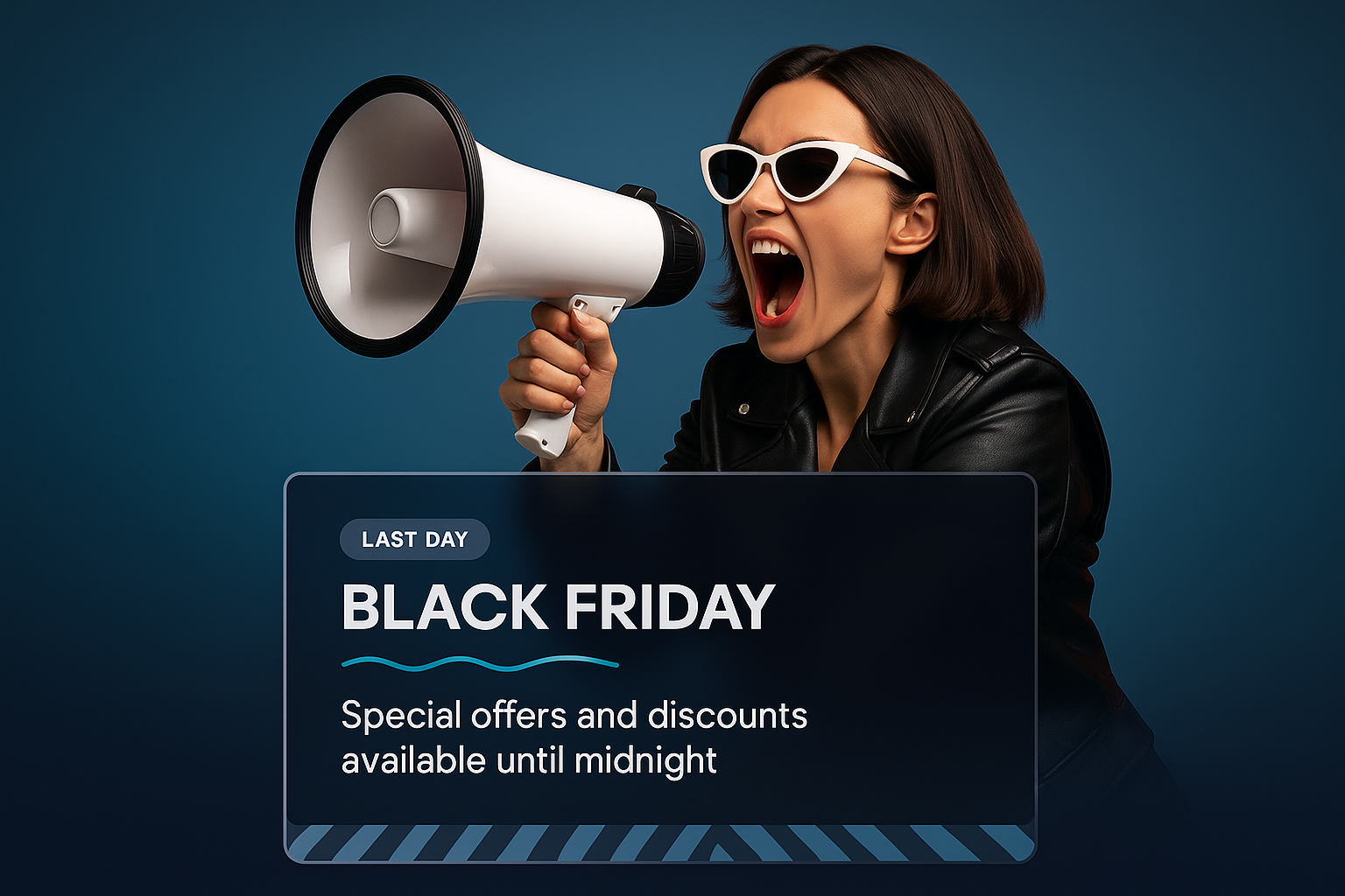 /Collection: /by davooda/Type: PNG/A stylish brunette woman passionately shouting through a megaphone, promoting final sales for Black Friday. The background features a smooth gradient, enhancing the vibrant energy of the announcement.