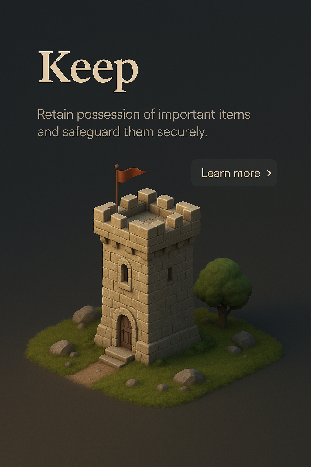 A zoomed-out 3D illustration of a castle keep set on a dark gradient background. Features a small tower with a flag, surrounded by rocks and a tree. Text elements include a title and a call-to-action button.