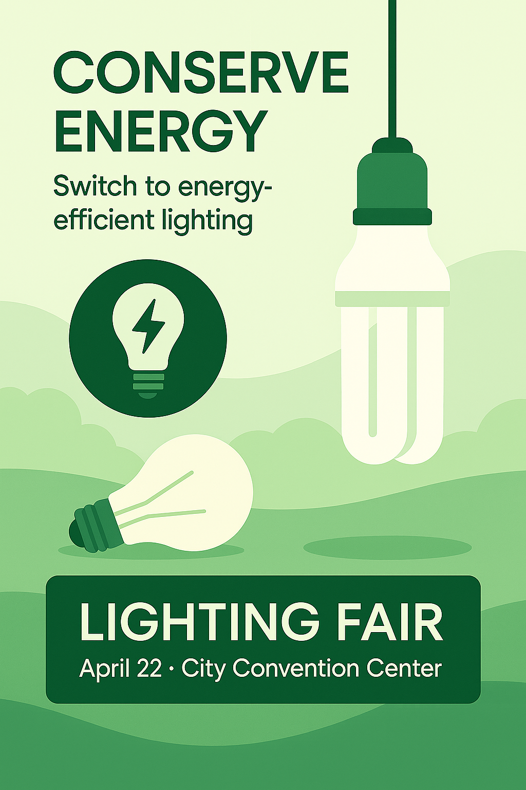 Informative promotional poster designed for an energy conservation event featuring light bulb graphics and eco-friendly themes, ideal for community awareness campaigns.