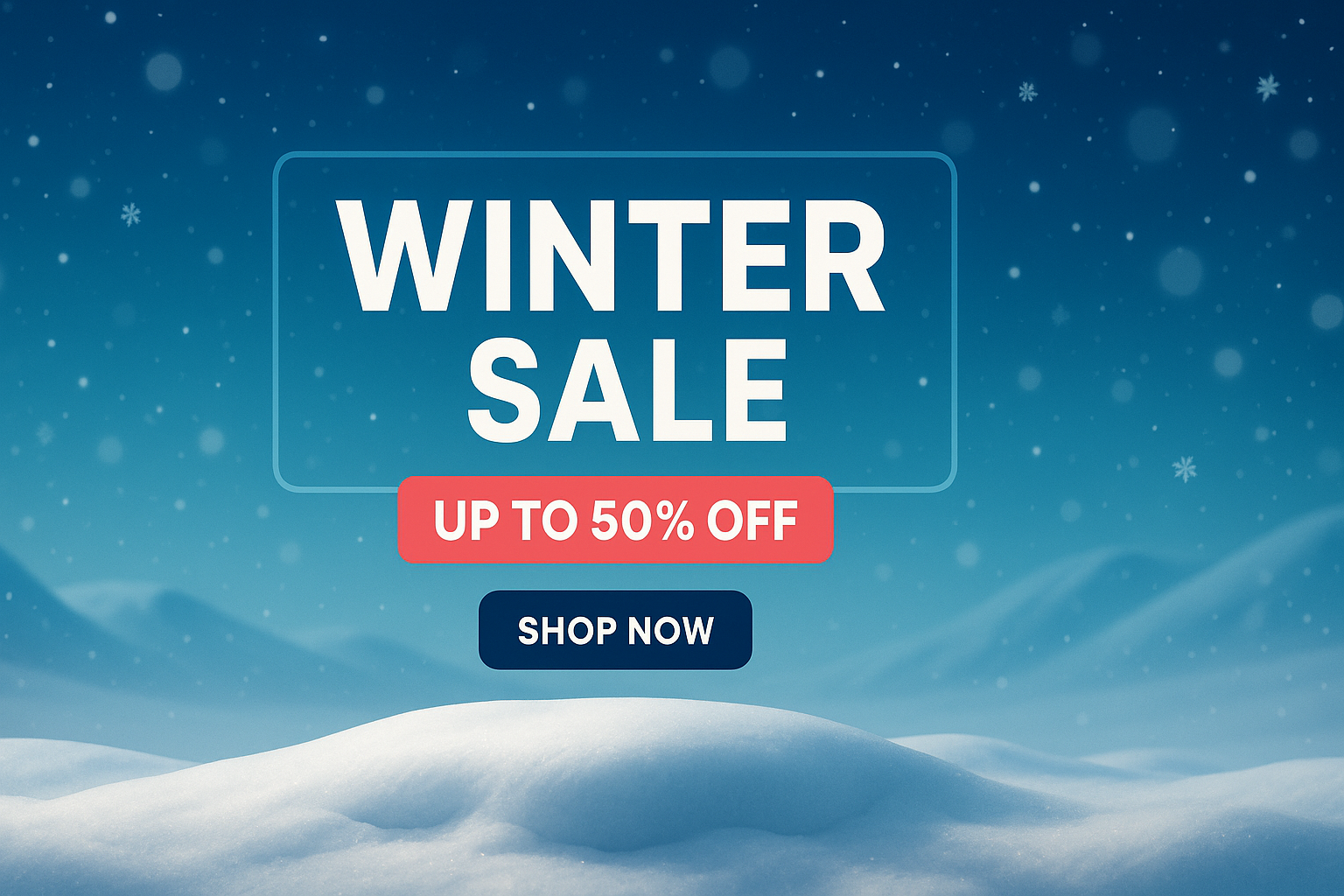 Vibrant promotional banner for a winter sale featuring a snowy landscape and bold typography. Ideal for e-commerce marketing to attract seasonal shoppers.