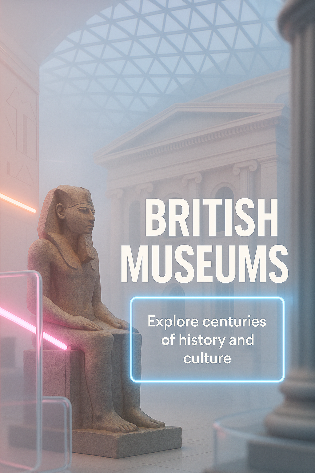 /Collection: /by davooda/Type: PNG/Visually engaging promotional image highlighting British Museums, featuring a statue and modern design elements. Ideal for cultural marketing and tourism.