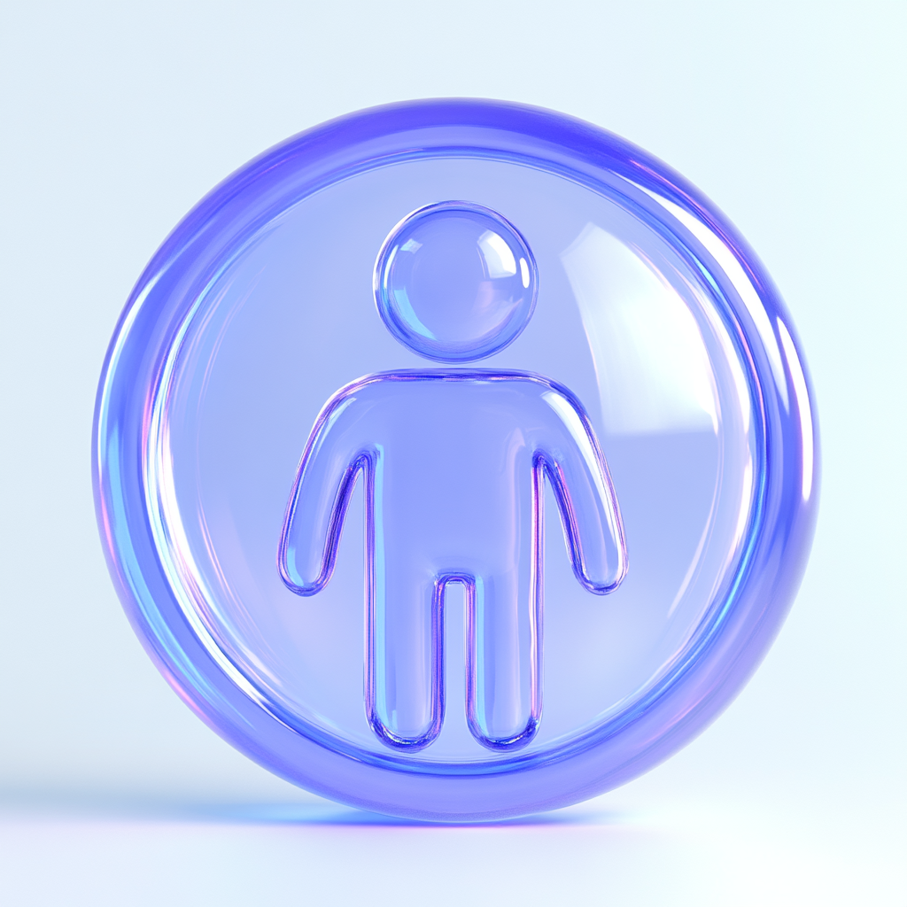 A modern 3D icon representing a person, designed in a glassy style within a circular shape. Ideal for use in user interface design or digital applications.