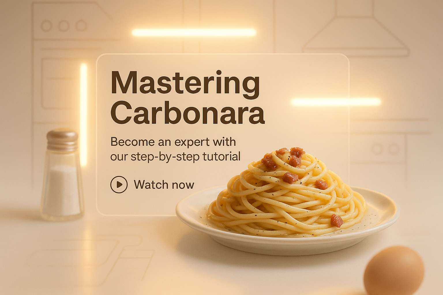 A visually appealing culinary tutorial banner showcasing a plate of carbonara pasta. The modern design elements and soft lighting cater to food enthusiasts looking to enhance their cooking skills.