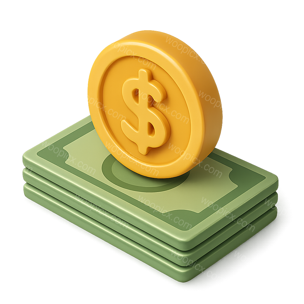 A vibrant 3D representation of a dollar coin resting atop a stack of green bills, featuring a glossy finish and isometric view, set against a soft gradient background.