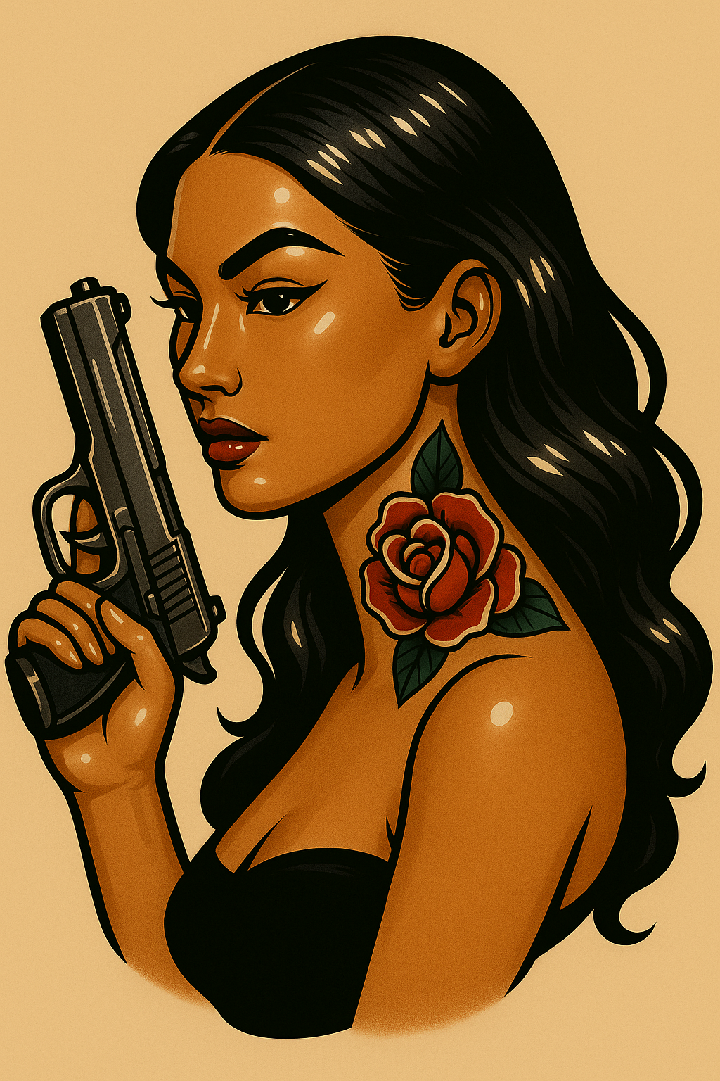 /Collection: /by davooda/Type: PNG/A stylized illustration featuring a woman holding a gun, adorned with a rose tattoo on her neck. The background is a soft beige, enhancing the glossy, anime-like finish of the artwork.