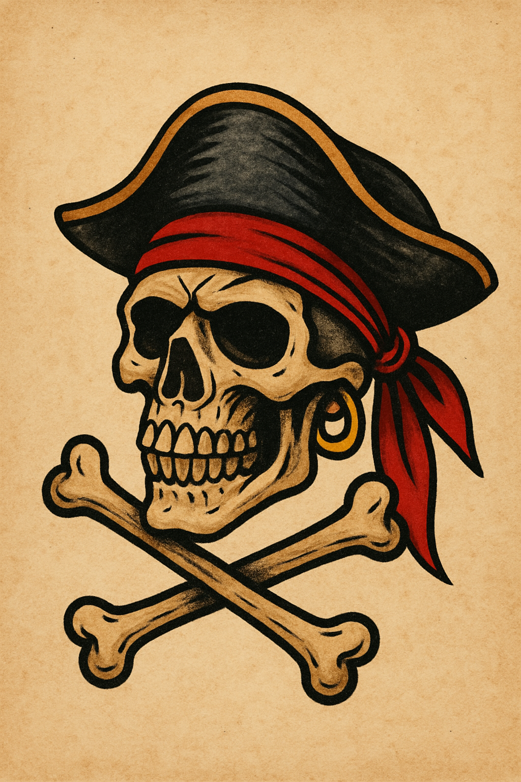 This image features a traditional pirate skull wearing a hat and bandana, crossed with bones. It showcases a vintage style suitable for pirate-themed designs.