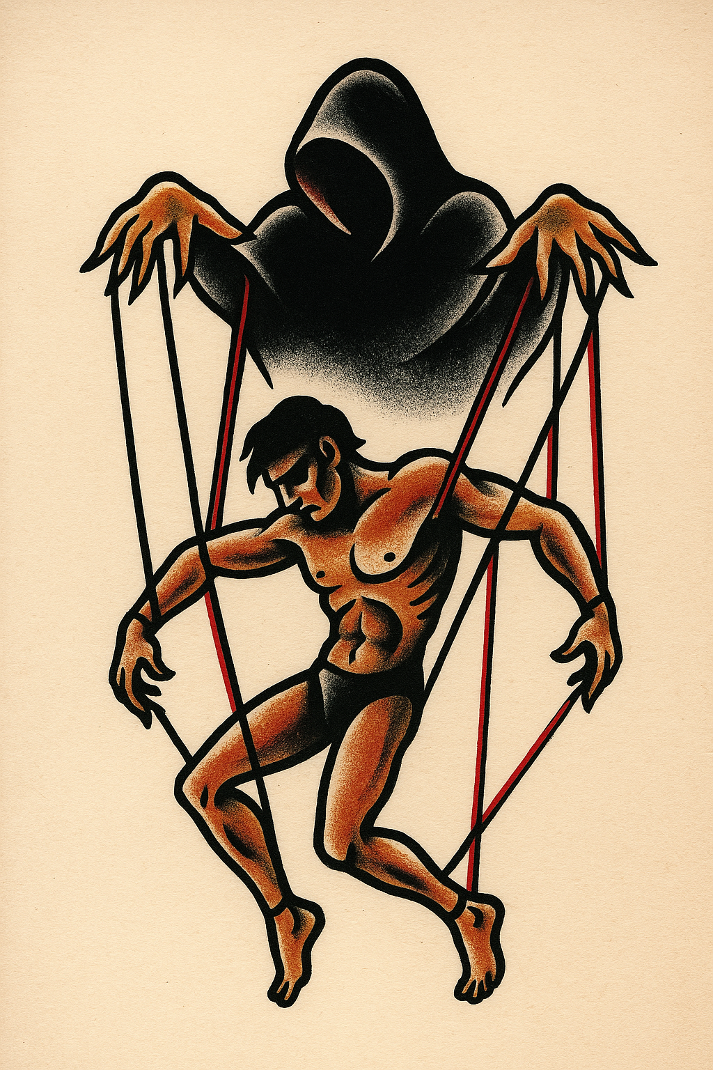 /Collection: /by davooda/Type: PNG/A striking tattoo design featuring a muscular man as a puppet, controlled by a shadowy figure. The artwork combines vibrant colors against a beige background, highlighting the dramatic theme.