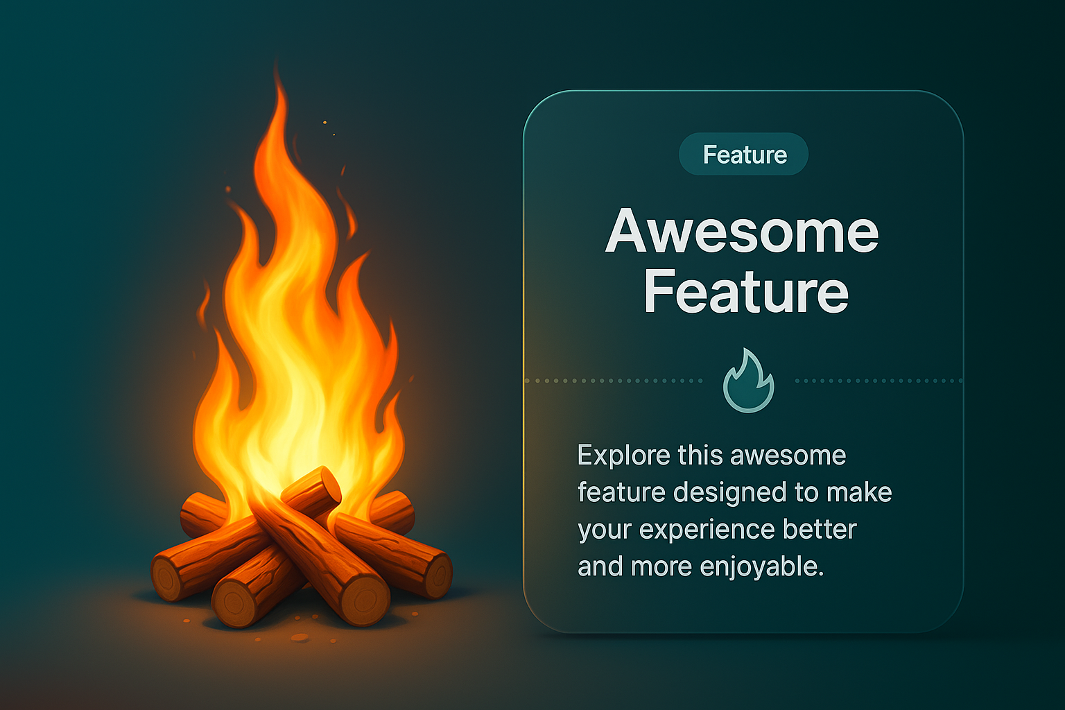 A 3D illustration of a bonfire with dynamic flames and wooden logs. Next to it, a feature block highlights an awesome feature, enhancing visual appeal.