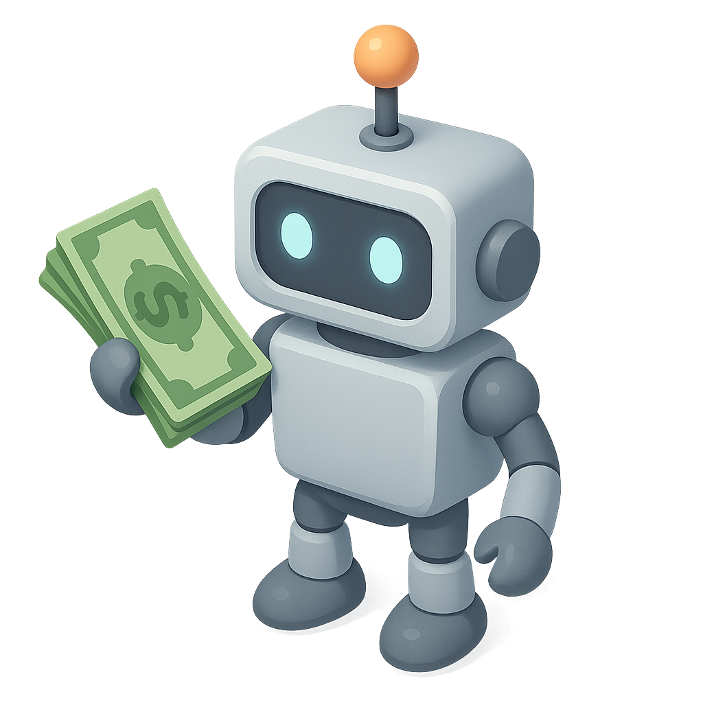 A stylized 3D robot character holding dollar bills, presented in an isometric view. The robot features a friendly design with glowing eyes and an antenna, set against a subtle gradient background.