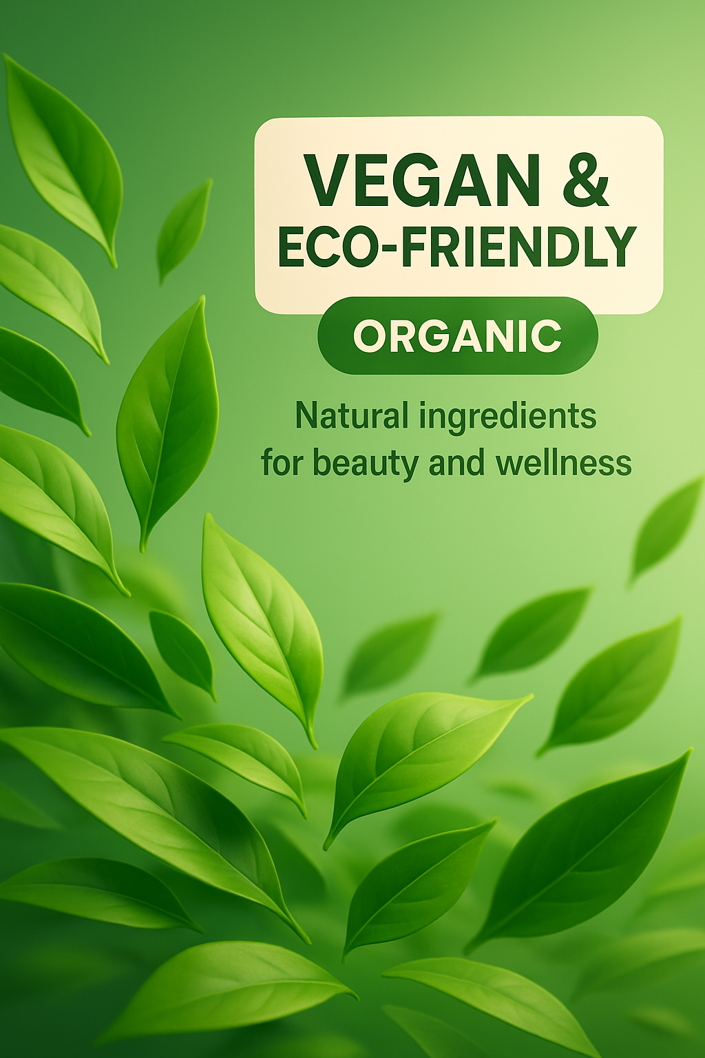 /Collection: /by davooda/Type: PNG/This is a vibrant promotional graphic highlighting vegan and eco-friendly organic ingredients. The design features lush green leaves, symbolizing nature and wellness, ideal for beauty product marketing.