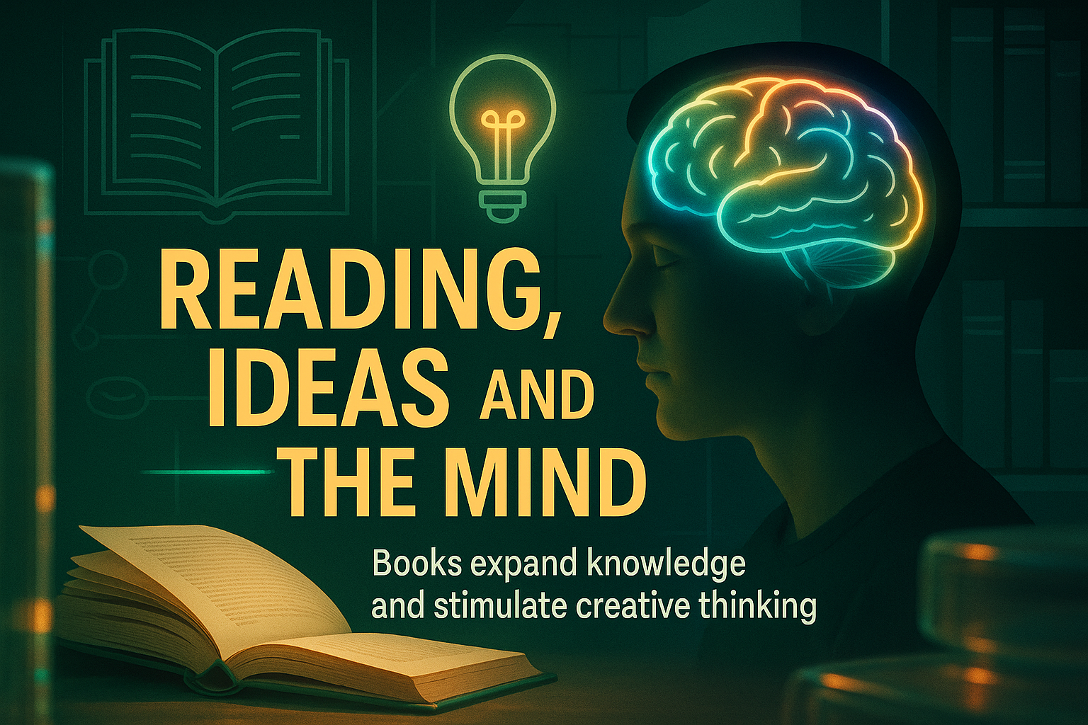 /Collection: /by davooda/Type: PNG/A visually striking image illustrating the connection between reading and creative thinking, featuring a silhouette of a person with a glowing brain. Ideal for educational and promotional materials.