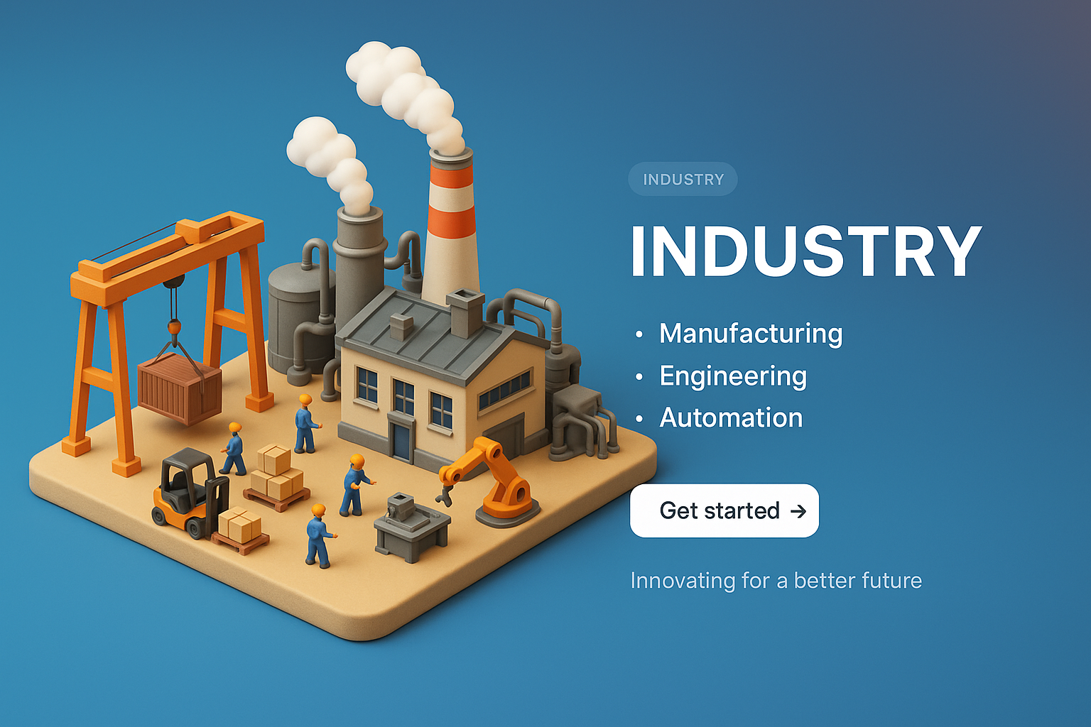 /Collection: /by davooda/Type: PNG/A zoomed-out 3D illustration depicting an industrial scene with small figures engaged in manufacturing tasks. The colorful, layered design features machinery and an inviting layout for effective information display.