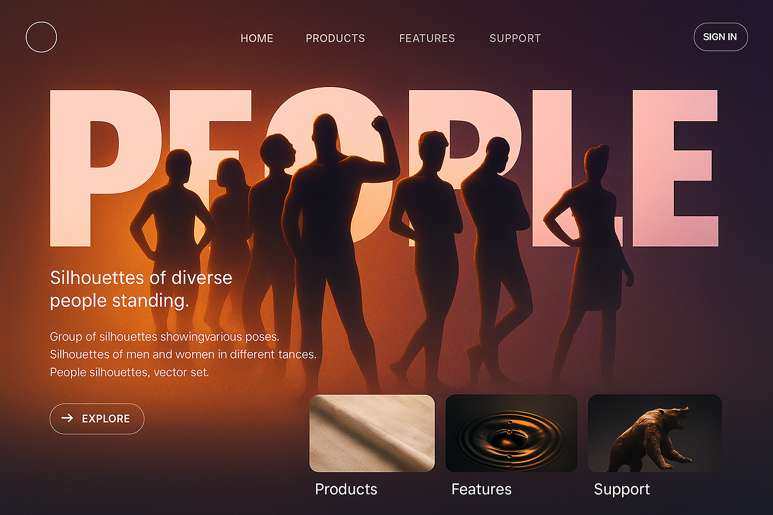 A modern landing page featuring silhouettes of diverse people in various poses. The design includes a bold headline, a gradient background, and sections for products and features.