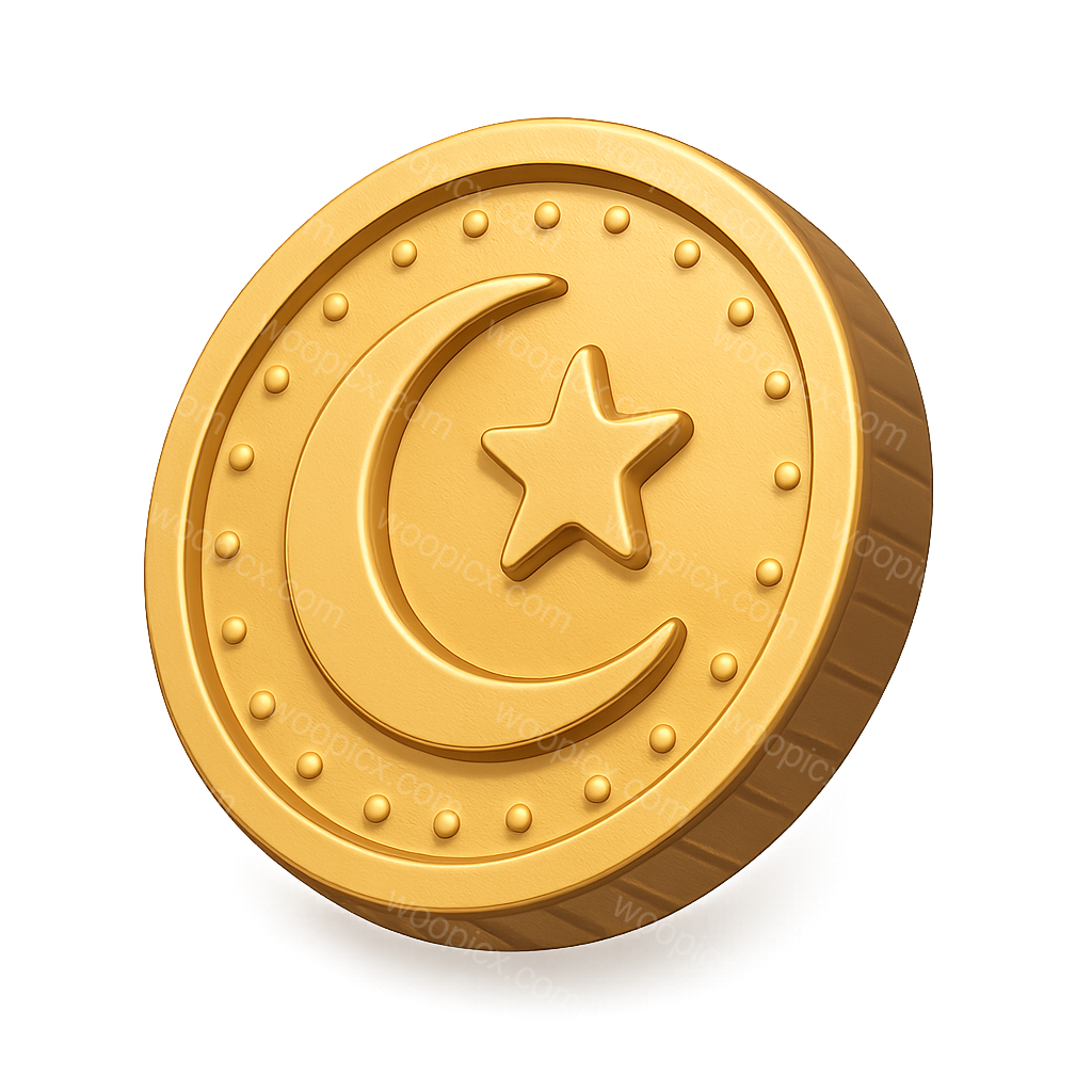 /Premium/Collection: /by davooda/Type: PNG/A realistic 3D rendering of an Islamic dinar coin featuring a crescent and star design. The coin is depicted in a three-quarter view with a glossy finish against a soft gradient background.