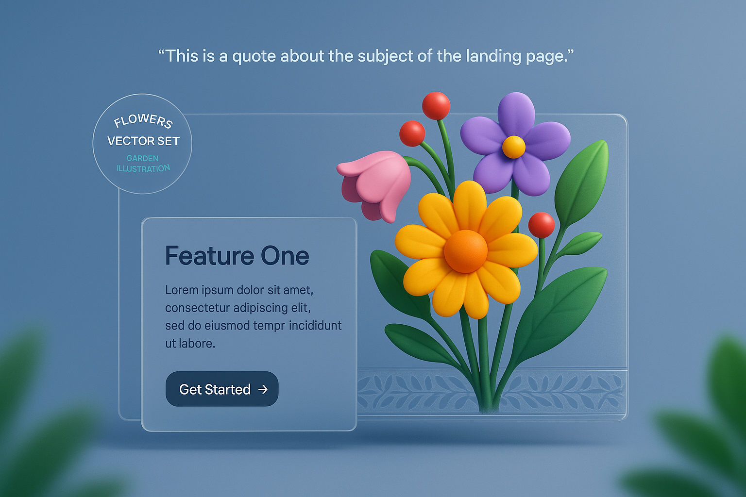 A vibrant 3D illustration featuring colorful flowers with a quote overlay. The design includes a transparent block highlighting features with a call-to-action button.