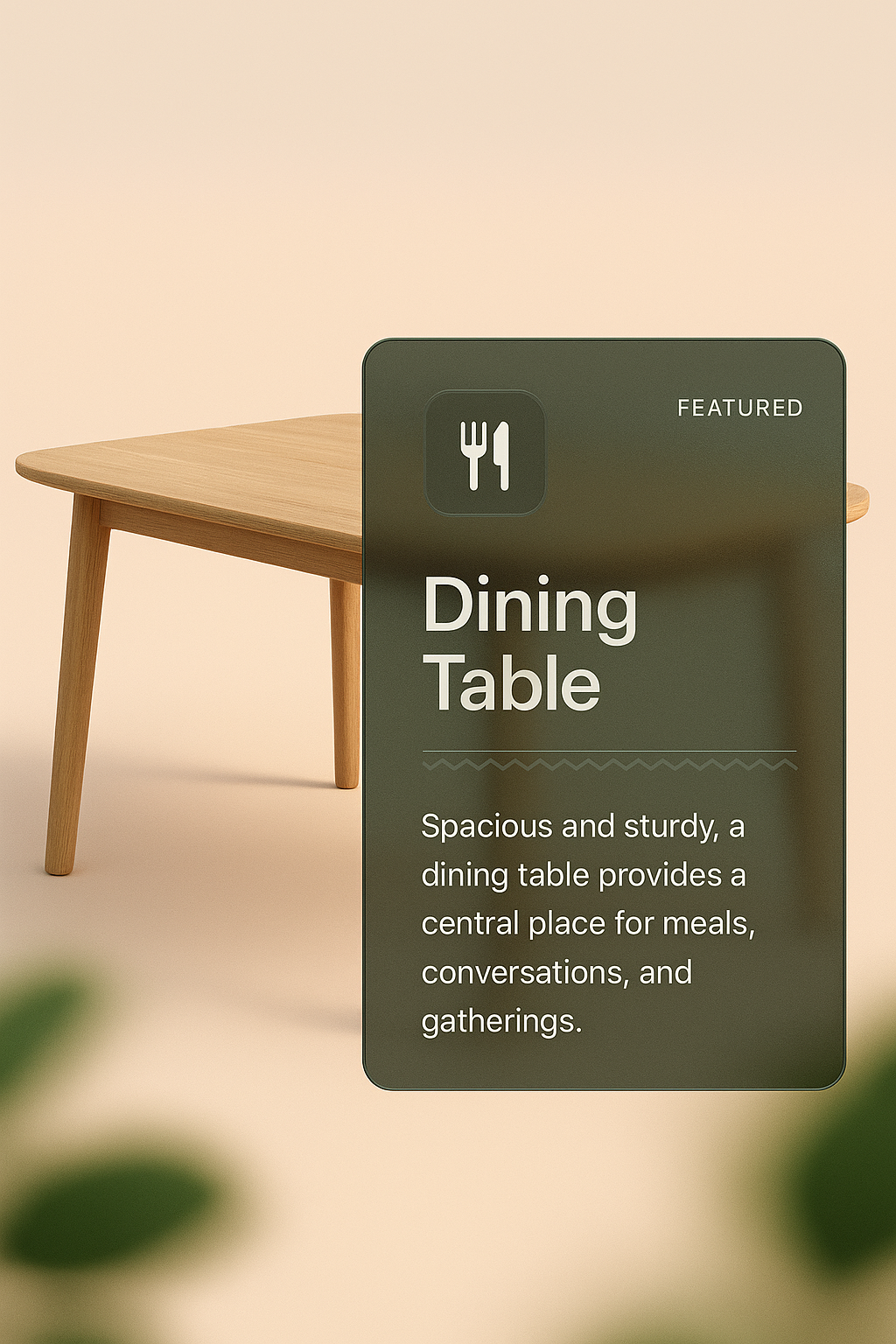 A chic dining table showcased with a stylish overlay featuring a header, icon, and text block. The design integrates a subtle gradient background and a translucent panel for a contemporary aesthetic.