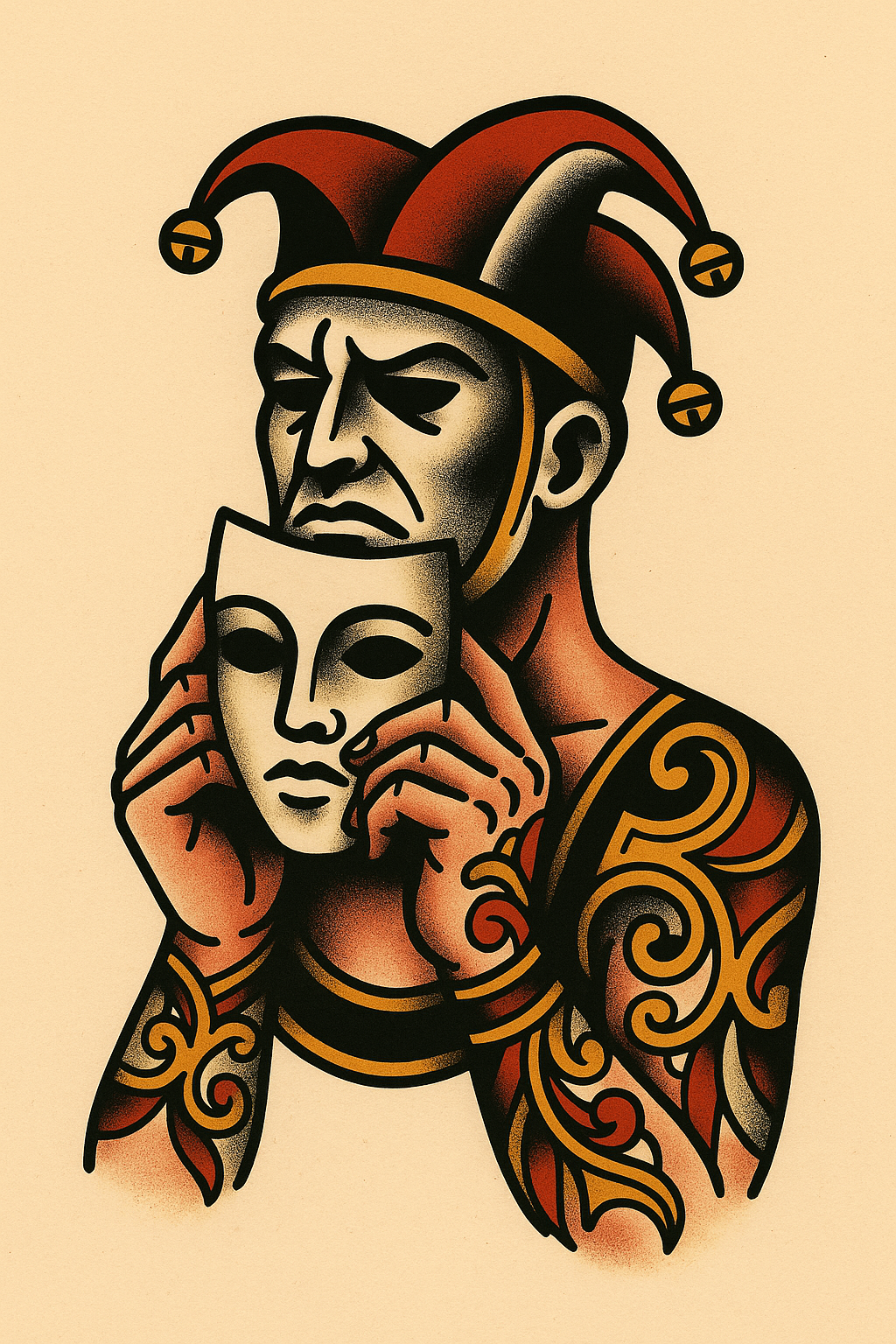 /Collection: /by davooda/Type: PNG/A striking illustration featuring a man holding a mask, symbolizing the infinite roles and attempts to hide one's true self. The artwork includes vibrant colors and tattoo-like designs against a light beige background.