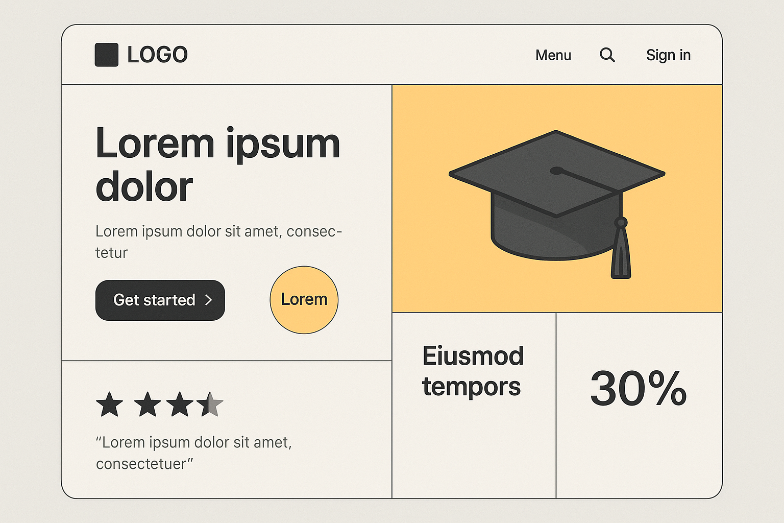 /Collection: /by davooda/Type: PNG/A clean and modern landing page design featuring a graduation hat, geometric blocks, and bold typography. The layout emphasizes clarity and balance, ideal for educational themes.