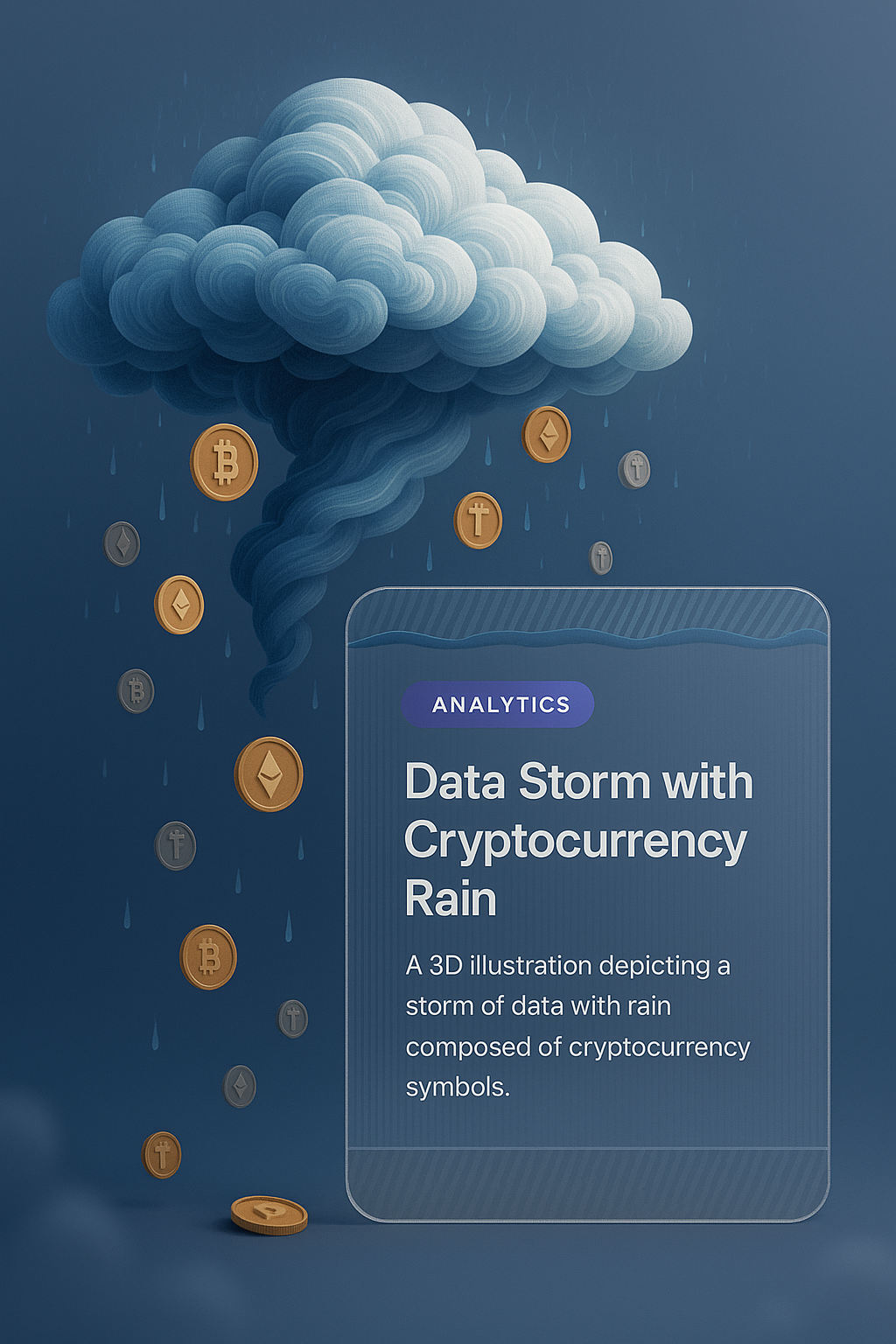 A captivating 3D illustration showing a storm cloud raining cryptocurrency symbols. The design features a gradient background and a stylish text block with analytics.