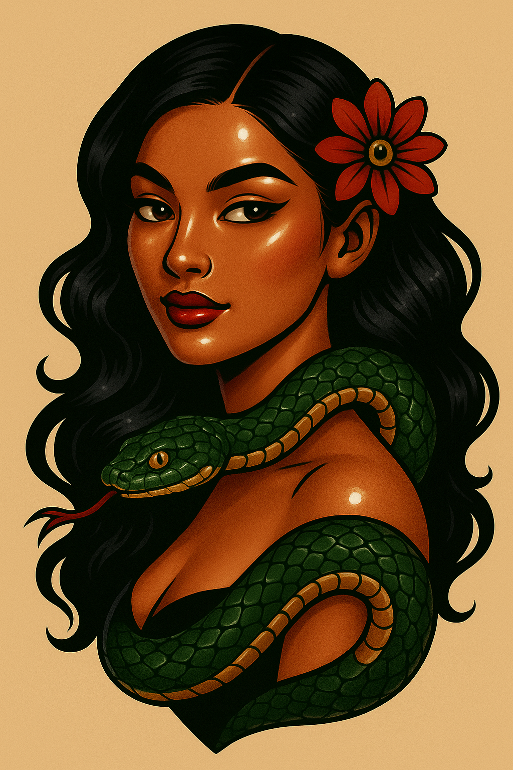 /Collection: /by davooda/Type: PNG/A striking illustration of a woman with long black hair and a snake draped around her neck. The design features glossy, anime-inspired highlights and a soft beige background, creating a captivating tattoo-like composition.
