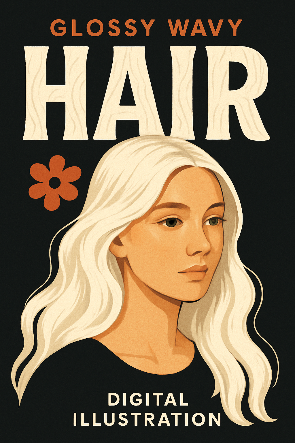 Vibrant digital artwork featuring a woman with glossy, wavy hair, complemented by bold typography. Ideal for beauty or haircare marketing.