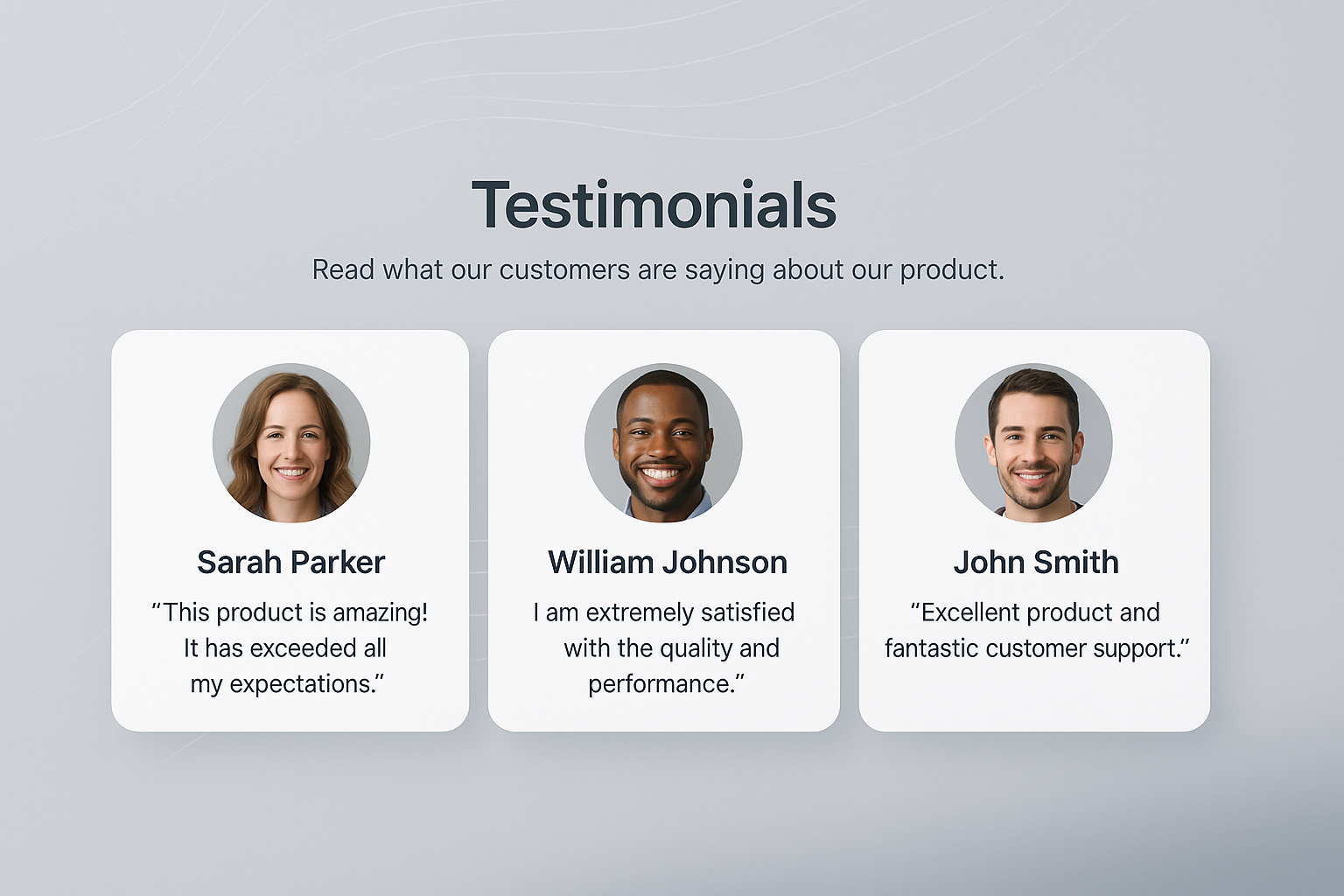/Collection: /by davooda/Type: PNG/A sleek testimonials section featuring three customer reviews. Each card includes a circular photo, name, and personalized testimonial, set against a soft gradient background.
