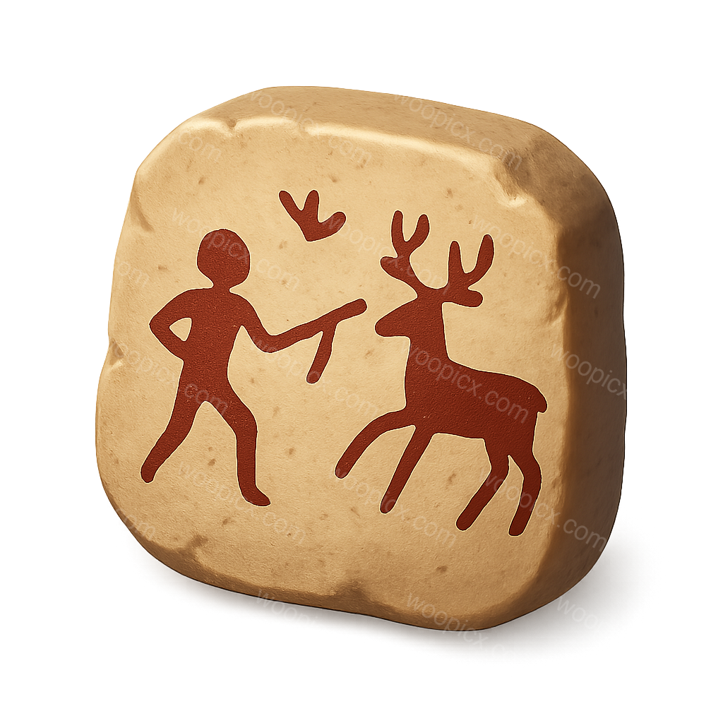 /Premium/Collection: /by davooda/Type: PNG/A stylized 3D representation of a cave painting depicting a human figure with a weapon alongside a deer, set against a smooth, rounded stone-like background.