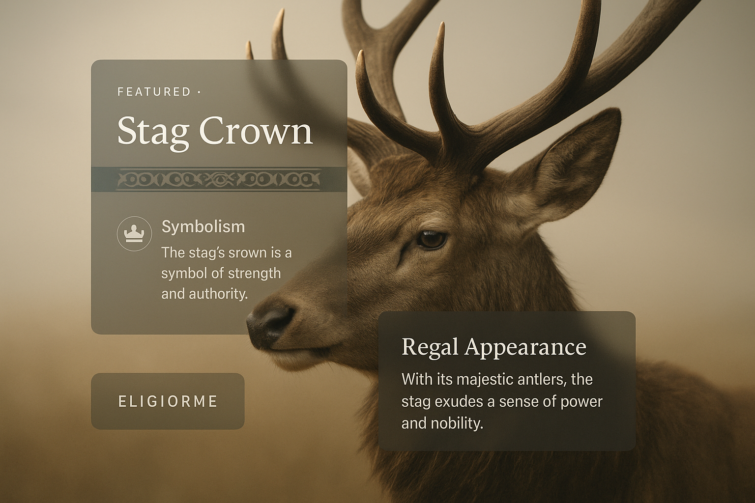 /Collection: /by davooda/Type: PNG/An elegant stag with impressive antlers features prominently, accompanied by a stylish text overlay describing its symbolism and regal appearance. The design integrates subtle gradients and a cohesive aesthetic.
