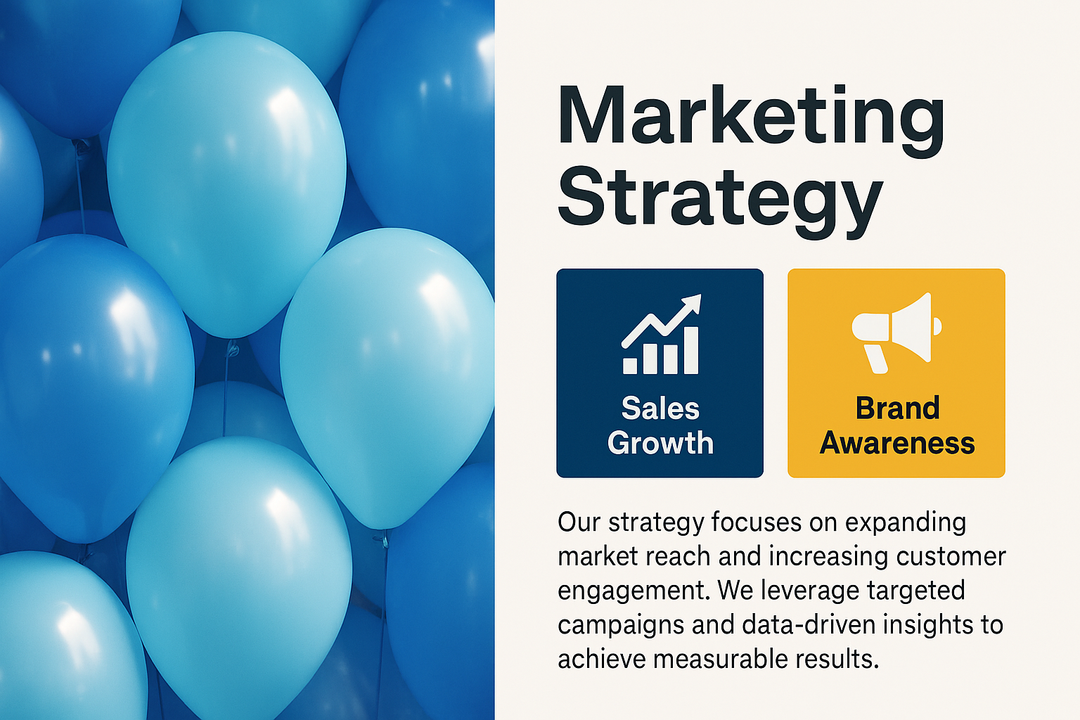 Promotional marketing strategy graphic featuring blue balloons, icons representing sales growth and brand awareness, ideal for presentations or social media posts.