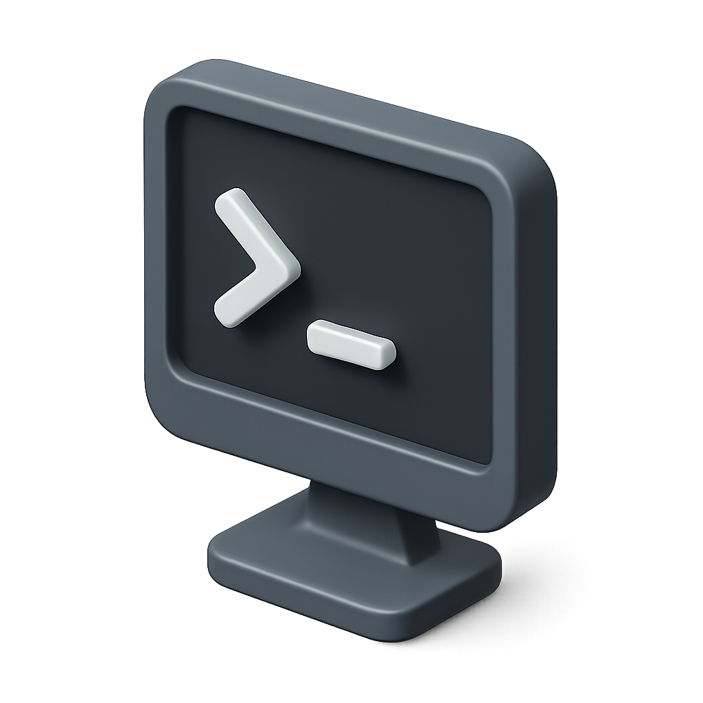 /Collection: /by davooda/Type: PNG/A sleek 3D icon representing a computer screen displaying a command prompt. The design features a minimalist aesthetic with a three-quarter view and a volumetric effect.