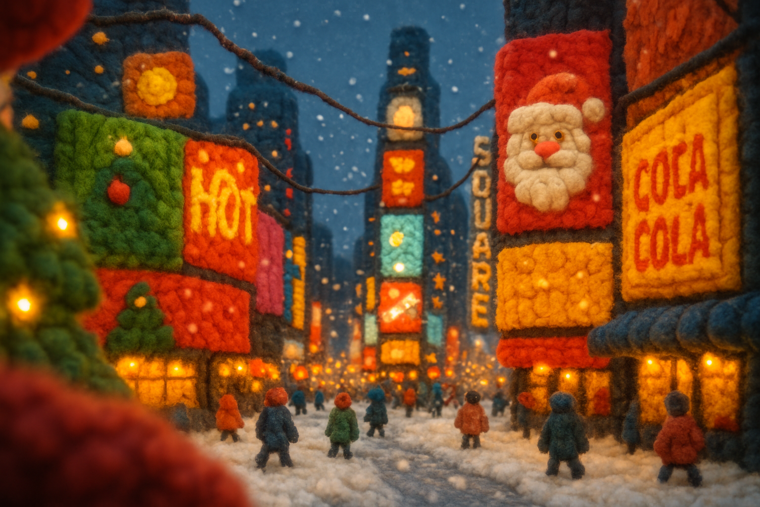 /Collection: /by davooda/Type: PNG/A vibrant 3D depiction of Times Square with a holiday theme. The scene features thick, wool-like textures, snowy streets, and small figures amidst colorful advertisements. Lights twinkle, enhancing the festive mood.