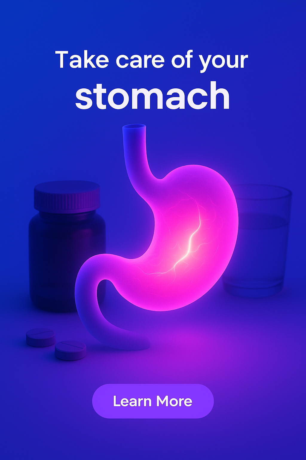 The image features a glowing stomach illustration in neon pink, surrounded by a pill bottle and glass of water. The background is a vibrant blue, enhancing the luminous effect.