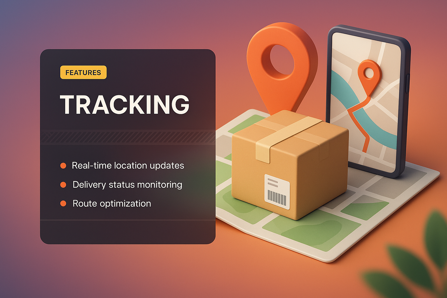 /Collection: /by davooda/Type: PNG/A 3D illustration showcasing a web page design focused on tracking features, including a package, smartphone, and map elements. The dark panel integrates seamlessly with the visual.