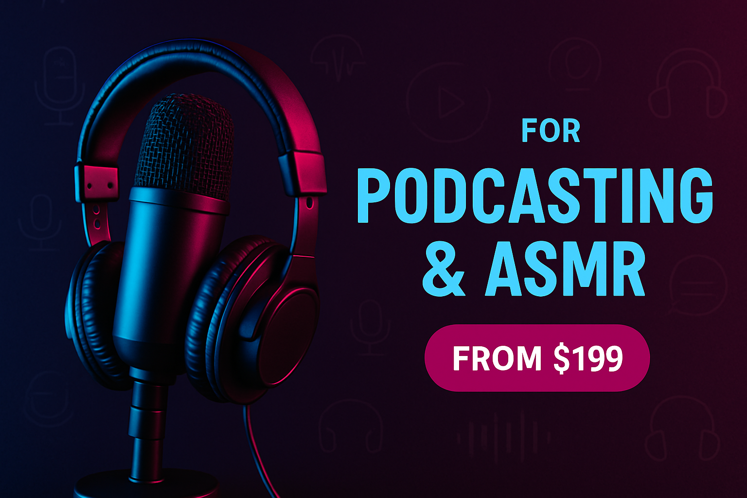 A vibrant close-up of a microphone and headphones designed for podcasting and ASMR, set against a dark background with neon cyan and magenta accents. The layout includes bold typography and a price tag.